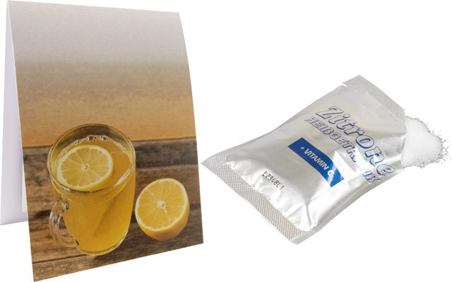 Nach einem Spaziergang im Schnee oder um einer Erkältung in der kalten Jahreszeit vorzubeugen ist ein Glas heiße Zitrone genau das Richtige. Schnell und unkompliziert mit heißem Wasser angerührt. Für Ihren Werbeeindruck gibt es ausreichend Platz auf dem Standardmotiv der Karte oder, ebenfalls ab 250 Stück, für eine eigene Gestaltung.