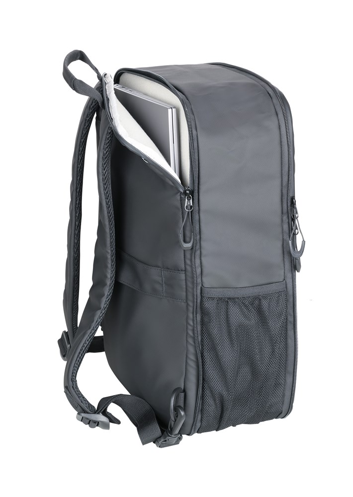 Laptop-Rucksack mit 2 großen Fächern (gepolstertes Laptopfach bis 16'' und Hauptfach) mit 2-Wege Reißverschluss, erweiterbar durch zusätzlichen Reißverschluss, 1 Fronttasche mit versteckbarem Reißverschluss-Schieber als Mini-Karabiner (Diebstahlschutz) + zusätzliches Frontfach, expandiert 2 Netztaschen für Flasche und Schirm, verstärkter Standboden, Schlaufe zur Befestigung am Trolley, Tragegriff, versteckte Rucksackgurte, wasserabweisende Reißverschlüsse außen, widerstandsfähiges Material, spritzwassergeschützt (Wasserdichtheitsgrad IPX4), Kapazität von ca. 6 Liter auf ca. 14 Liter erweiterbar, Tarpaulin: 80% Polyester, 20% Polyurethan (PU), Polyester, Polyurethan, Tarpaulin (Plane), schwarz
