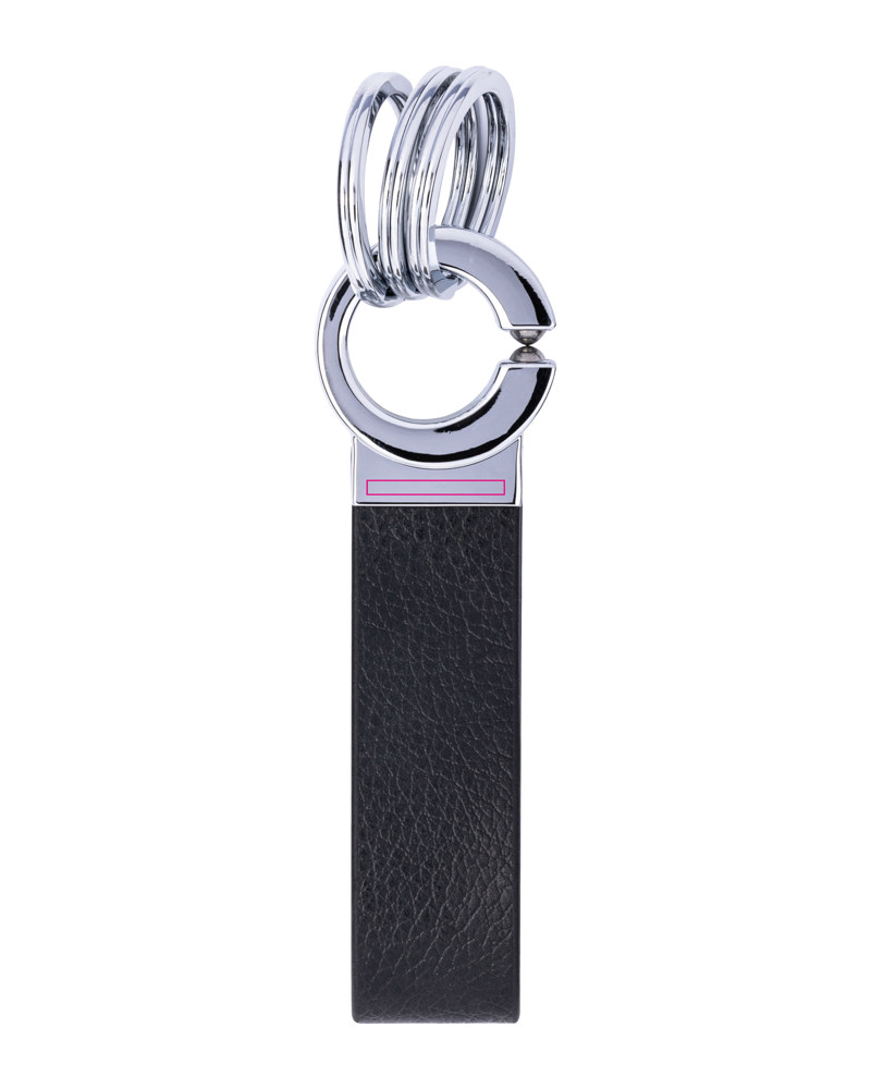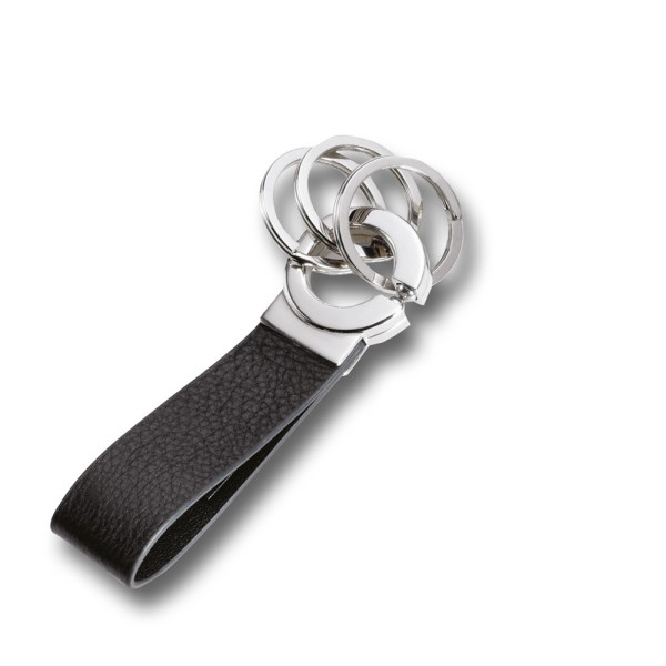 Schlüsselanhänger mit praktischem "Klick-Verschluss", Lederschlaufe, 3 Schlüsselringe, Leder, Metall, verchromt, glänzend, schwarz/silberfarben