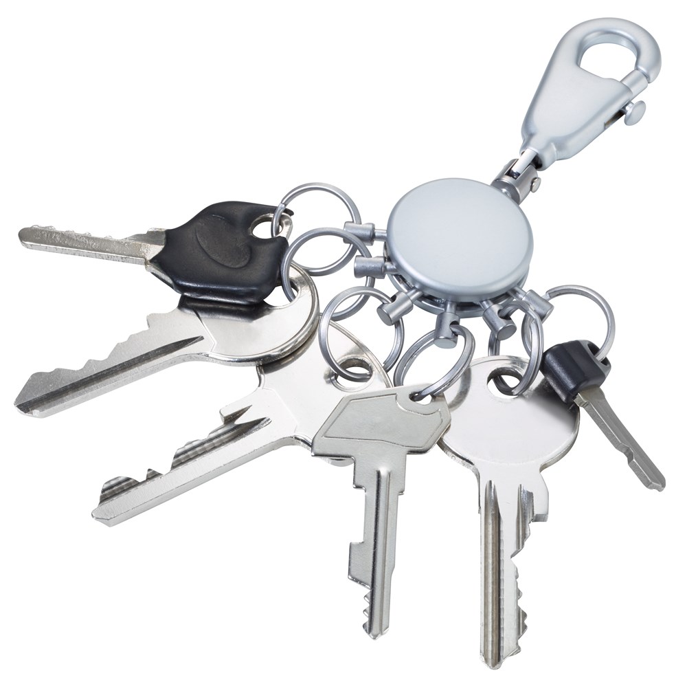Schlüsselanhänger, rund, inkl. Karabinerhaken, 6 ausklinkbare Ringe, Messing, Metall, Metall/Messing, verchromt, matt, silberfarben