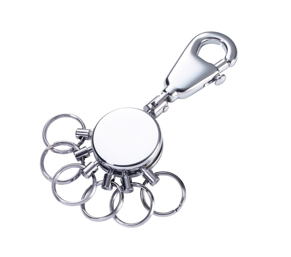 Schlüsselanhänger, rund, inkl. Karabinerhaken, 6 ausklinkbare Ringe, 6 austauschbare Ringe, Messing, Metall, verchromt, glänzend, silberfarben