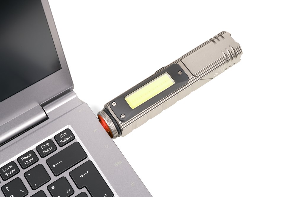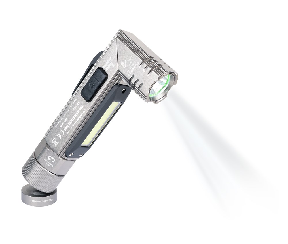 Taschenlampe / Knicklampe, multifunktional: Arbeits- und Sicherheitslicht, 5 Leuchtfunktionen, Frontlampe: 100% Licht + 50% Licht (weißes LED, 200 Lumen), seitliches COB-LED (150 Lumen): Arbeitslicht, rotes Licht, schnell blinkendes rotes Licht, Leuchtkopf um bis zu 90° abknickbar für optimales Ausleuchten, Magnetfunktion: am Haltefuß aufschrauben und drehbar an Metalloberflächen befestigen, Gürtelclip, 2.000 mAh Lithium Ionen Akku, umweltschonend da wiederaufladbar über integrierten USB-Stecker, spritzwassergeschützt (Wasserdichtheitsgrad IPX4), ABS Kunststoff, Aluminium, matt, titanfarben