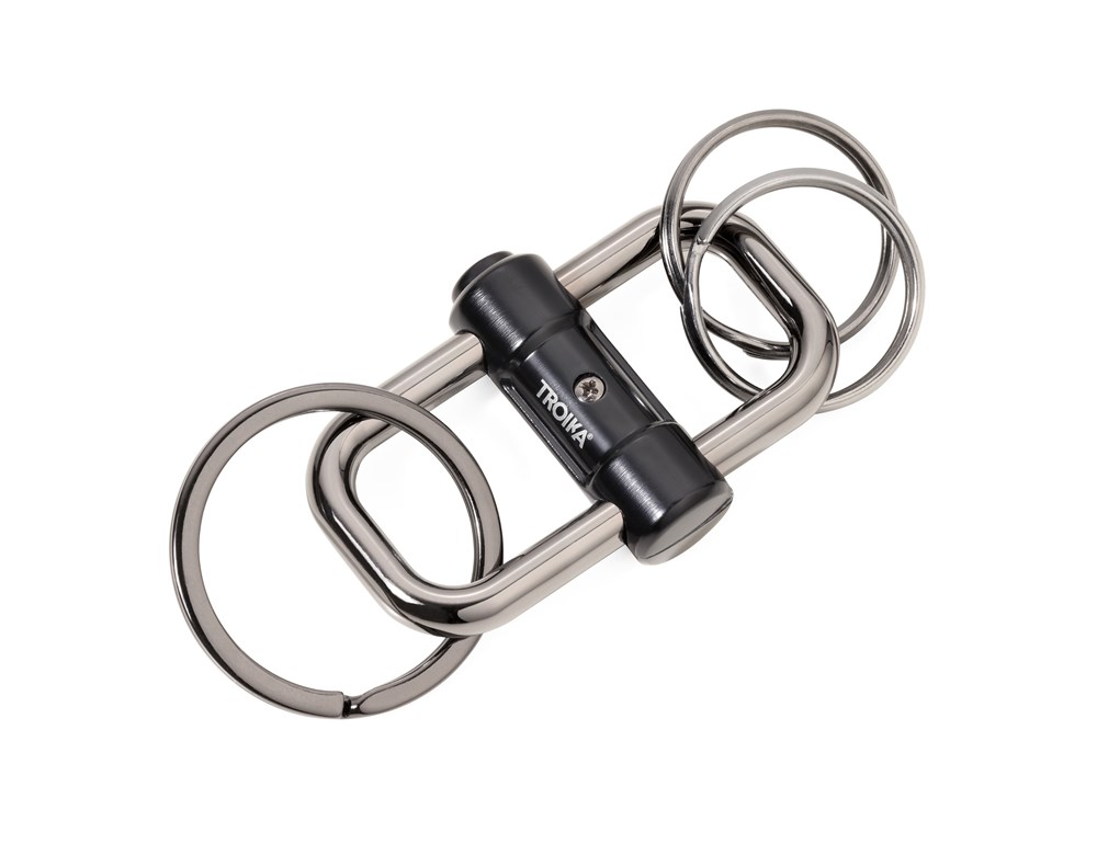 Schlüsselanhänger mit 3 Schlüsselringen in 2 Größen, Schiebeverschluss zur einfachen Schlüsselorganisation, Verschieben des Mittelteils zu beiden Seiten hin gibt Ringe frei, Metallguss, glänzend, gunmetal/schwarz