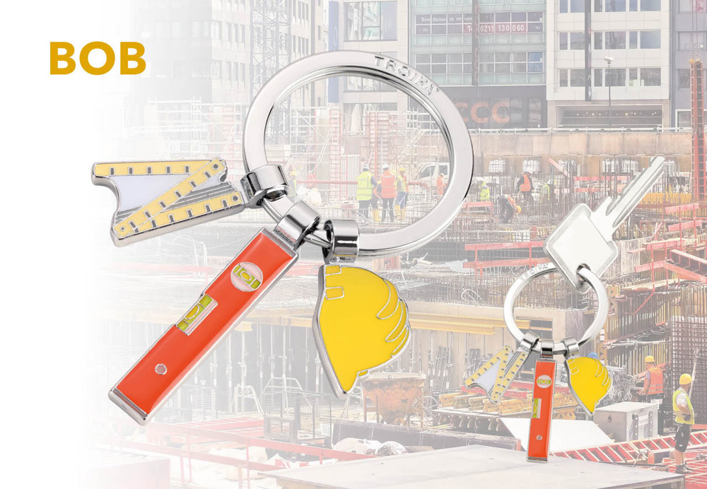 Schlüsselanhänger mit 3 Anhängern, Zollstock, Wasserwaage und Bauhelm, Emaille, Metallguss,... mehr