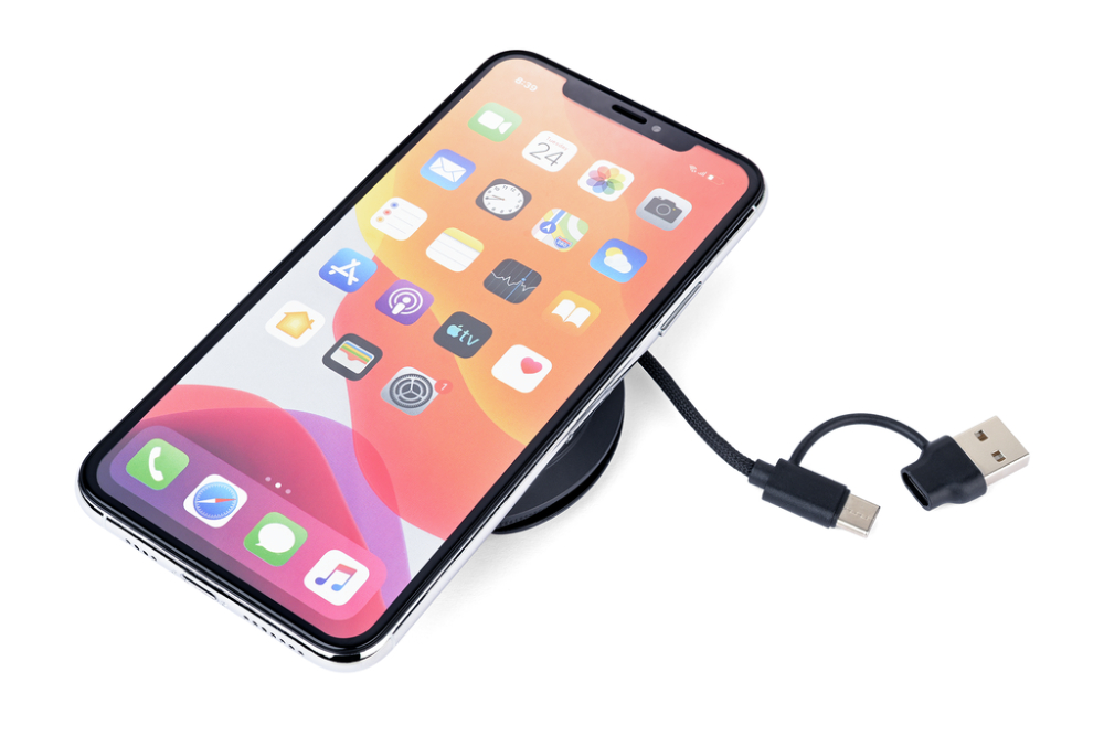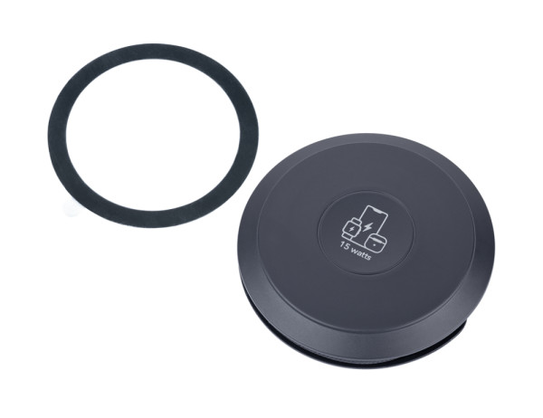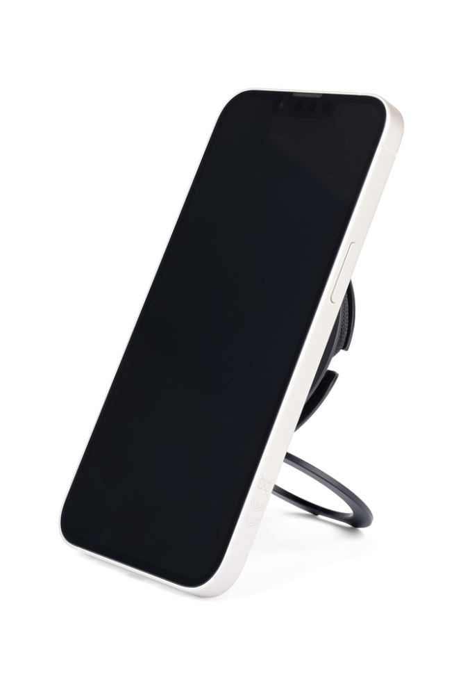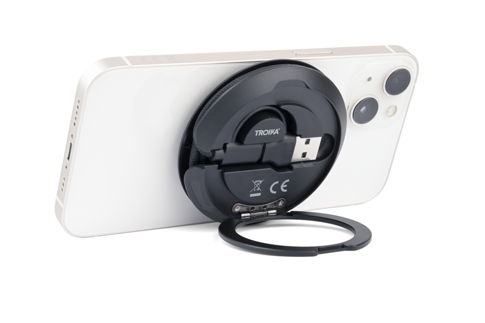 Induktives Ladegerät für iPhone®, Apple Watch® und AirPods®, schnellladefähig bis zu 15W, kompatibel mit MagSafe, mit integriertem, praktisch verstaubarem USB-C/USB-A Ladekabel (Gesamtlänge 60 cm), Kabel textilummantelt (Netzstruktur), recyceltes Polyester, ausklappbarer Metallring auf der Rückseite (Aufstellfunktion), inkl. zusätzlichem MagSafe Metallring mit 3M Klebefläche zur individuellen Befestigung an allen gängigen Smartphones, Kunststoff, recyceltes Polyester, schwarz