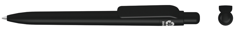 Druckkugelschreiber aus recyceltem PET-Material mit matt gedecktem Gehäuse, Clip, Drücker und Stopfen.
