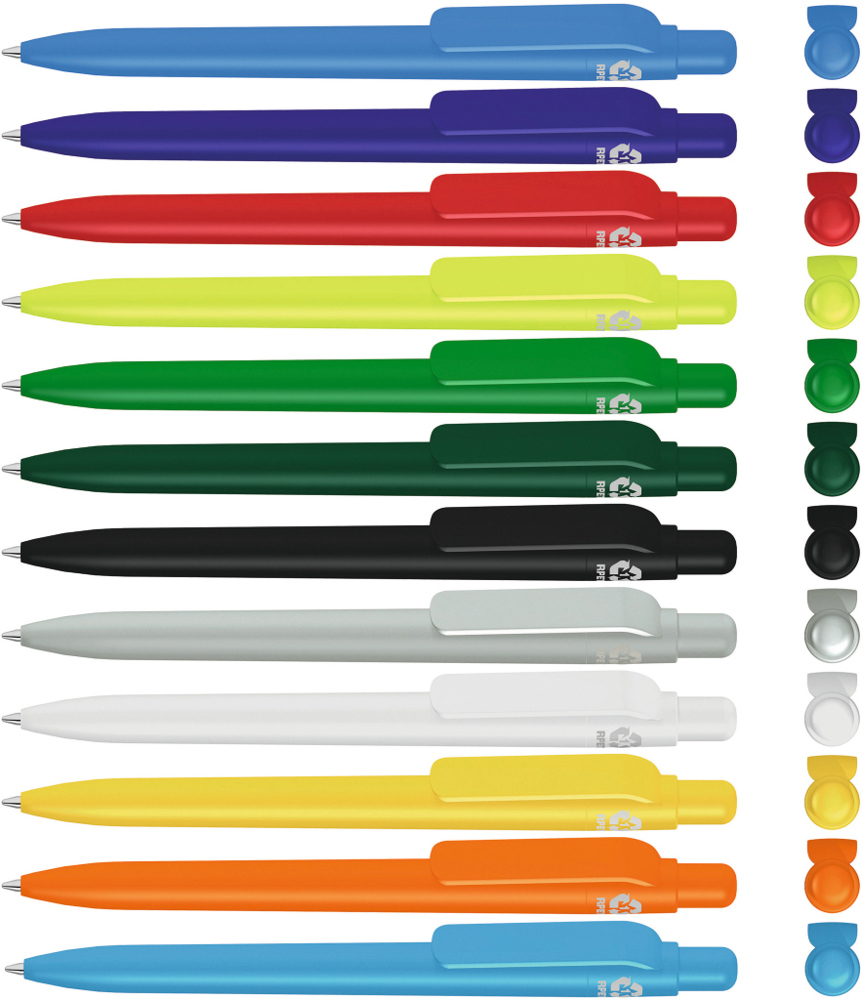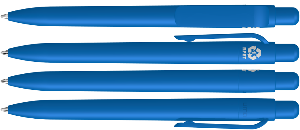 Druckkugelschreiber aus recyceltem PET-Material mit matt gedecktem Gehäuse, Clip, Drücker und Stopfen.