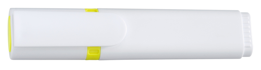 Textmarker mit Kunststoffgehäuse, Kappe und Clip in weiß. Mundstück mit Zierring und Stopfen in der Schreibfarbe. Standardfarben gelb, grün, magenta, blau, orange.