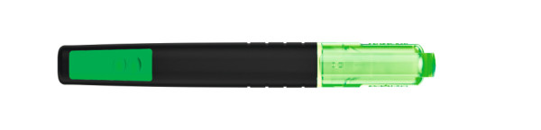 Flüssig-Textmarker in Stiftform mit schwarzem Schaft und transparenter Kappe in Schreibfarbe. mehr
