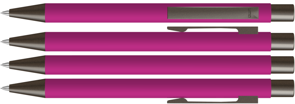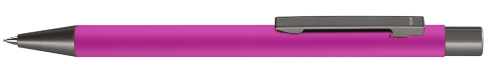 Metall-Druckbleistift (0,7mm) mit Softtouch-Gehäuse. Metallclip, Metallspitze und Drücker GUN metallic. Radiergummi im Drücker.