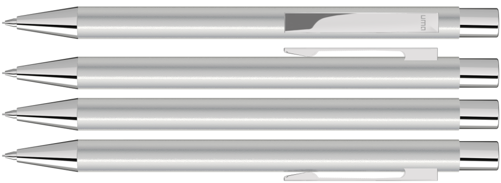 Metall-Druckbleistift (0,7mm) mit mattem Gehäuse. Metallclip, Metallspitze und Drücker silber glänzend. Radiergummi im Drücker.