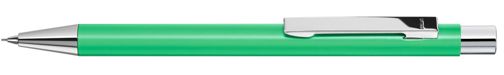 Metall-Druckbleistift (0,7mm) mit mattem Gehäuse. Metallclip, Metallspitze und Drücker silber glänzend. Radiergummi im Drücker.