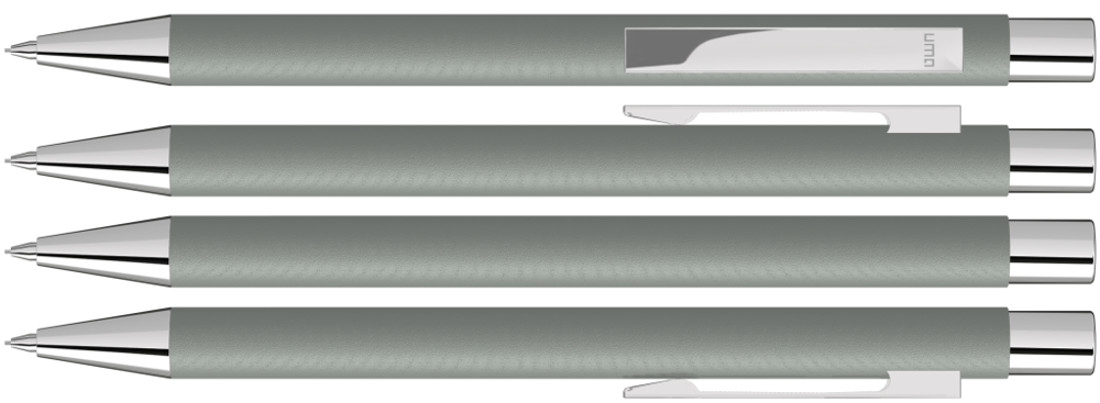 Metall-Druckbleistift (0,7mm) mit mattem Gehäuse. Metallclip, Metallspitze und Drücker silber glänzend. Radiergummi im Drücker.