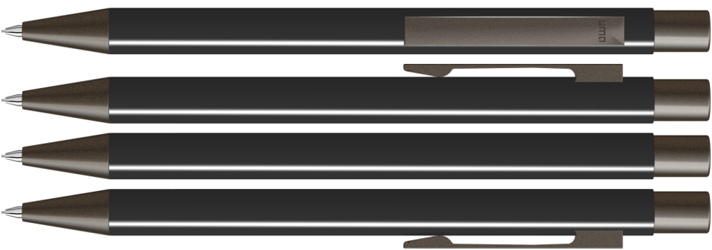 Metall-Druckbleistift (0,7mm) mit glänzendem Gehäuse. Metallclip, Metallspitze und Drücker GUN metallic. Radiergummi im Drücker.