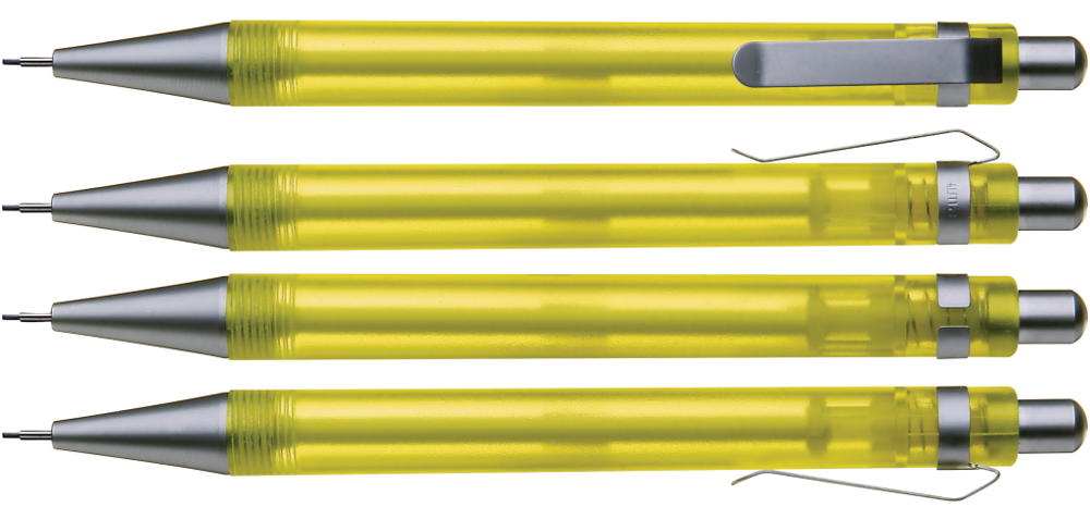 Druckbleistift (0,7mm) mit transparent gefrostetem oder gedecktem Gehäuse. Metalldrücker, Metallclip und Metallspitze matt verchromt.