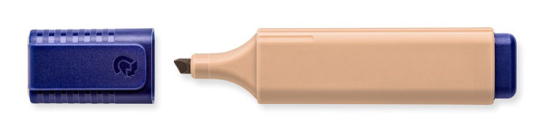 Textmarker mit großem Tintenspeicher für extra lange Markierleistung, Tinte auf Wasserbasis, sekundenschnell trocken, Drehkappe für leichtes Öffnen, Schaft in Tintenfarbe pastell oder vintage, Schoner und Abschlusskappe dunkelblau, Made in Germany