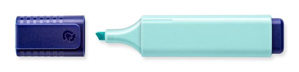 Textmarker mit großem Tintenspeicher für extra lange Markierleistung, Tinte auf Wasserbasis, sekundenschnell trocken, Drehkappe für leichtes Öffnen, Schaft in Tintenfarbe pastell oder vintage, Schoner und Abschlusskappe dunkelblau, Made in Germany