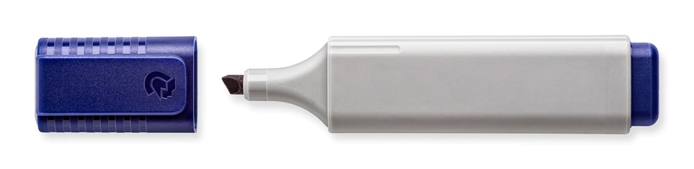 Textmarker mit großem Tintenspeicher für extra lange Markierleistung, Tinte auf Wasserbasis, sekundenschnell trocken, Drehkappe für leichtes Öffnen, Schaft in Tintenfarbe pastell oder vintage, Schoner und Abschlusskappe dunkelblau, Made in Germany