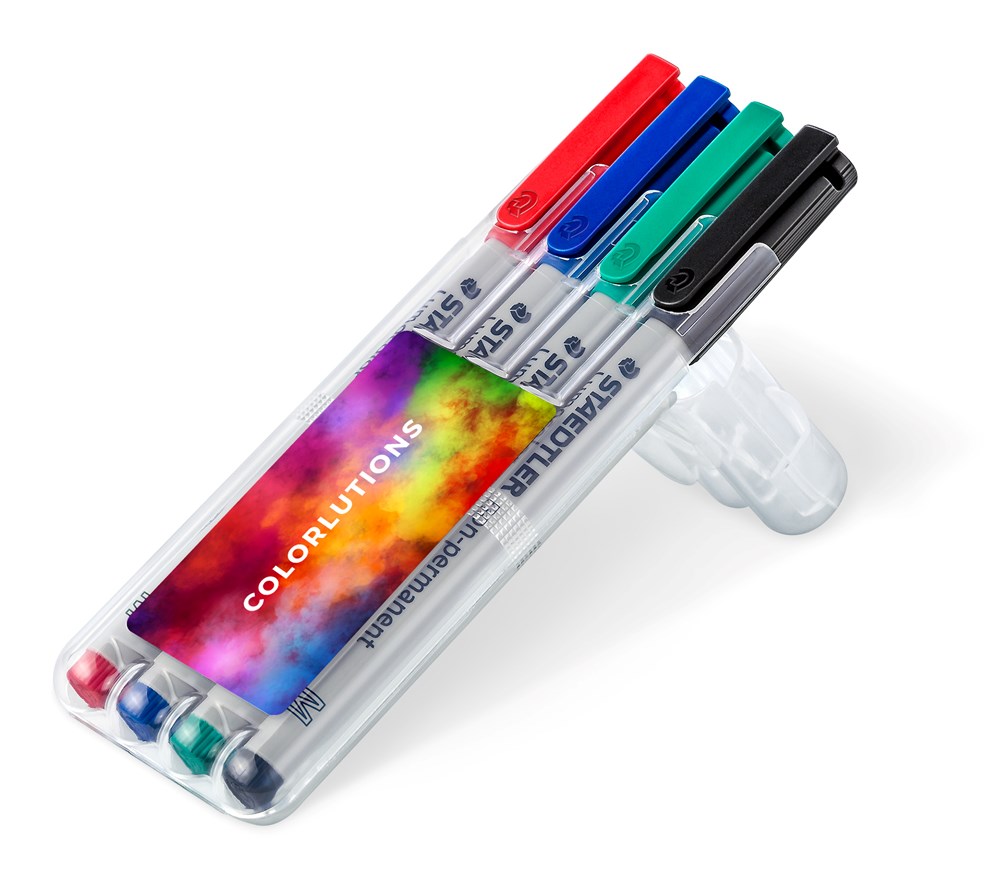 Universalstift für fast alle Oberflächen, für Overhead-Projektion geeignet, wasserlösliche Tinte, Strichstärke M (medium, ca. 1,0 mm), Schaft grau, Schoner und Abschlusskappe in Tintenfarbe, Stifte mit STAEDTLER Druck, Gehäuse aus 97 % recyceltem Plastik, 4 Farben in der aufstellbaren STAEDTLER Box, Made in Germany
