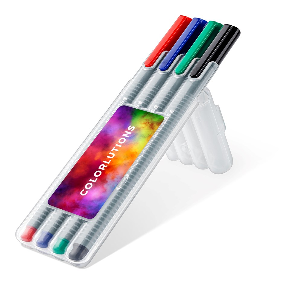 Faserschreiber mit superfeiner, metallgefasster Spitze, ergonomischer Dreikantschaft, DRY SAFE - kann tagelang offen liegen ohne einzutrocknen, aus vielen Textilien auswaschbar, Strichbreite ca. 0,3 mm, Schaft silbergrau, Schoner in Tintenfarbe, Gehäuse aus 97 % recyceltem Plastik, 4 Farben in der aufstellbaren STAEDTLER Box, Made in Germany
