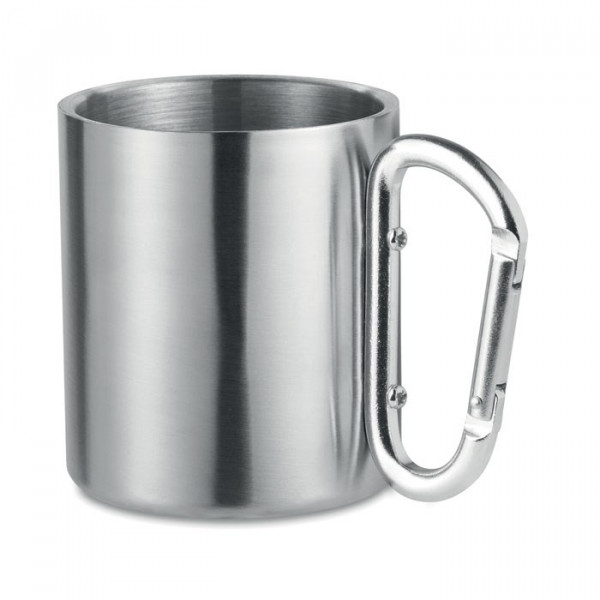 Doppelwandiger Trinkbecher aus Edelstahl. Henkel mit Karabiner. Füllmenge: 220 ml. Der Karabiner ist NICHT als Sicherung beim Klettern geeignet.