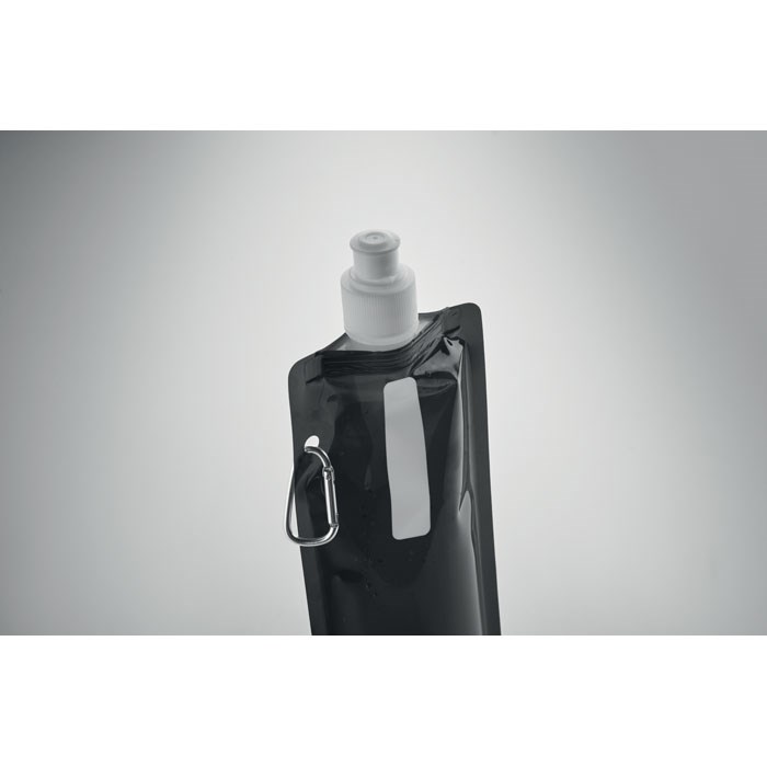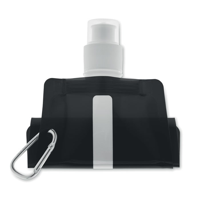 Faltbare Wasserflasche aus BPA freiem PET mit Alu-Karabiner. Füllmenge: 480 ml.