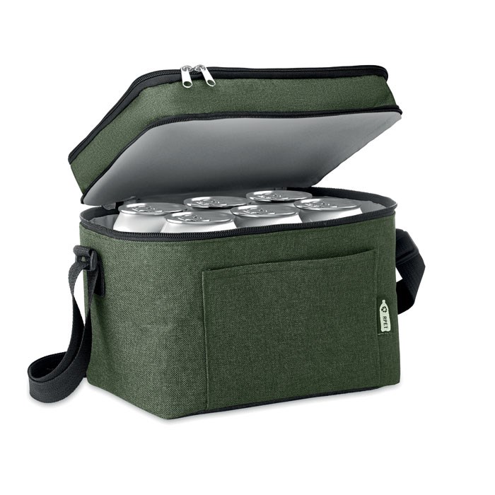 2 tone Kühltasche aus 600D RPET. Mit 2 Fächern und PEVA-Futter. Verstellbarer Schultergurt und Fronttasche. Isoliermaterial: 0,15 mm PEVA + 3 mm Schaumstoff. Füllmenge: 3l.