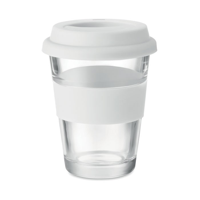 Trinkbecher aus Glas mit Silikon-Deckel und -Griff. Füllmenge: 350 ml. Da der einwandige Becher die Hitze nach außen leiten kann, kann der Artikel heiß werden.