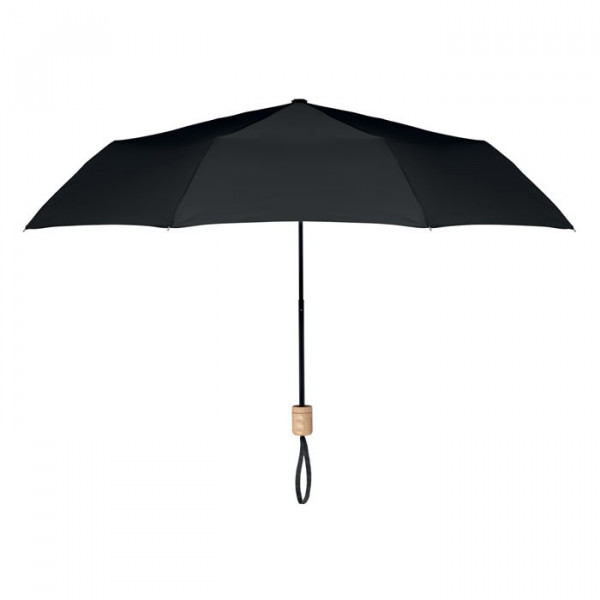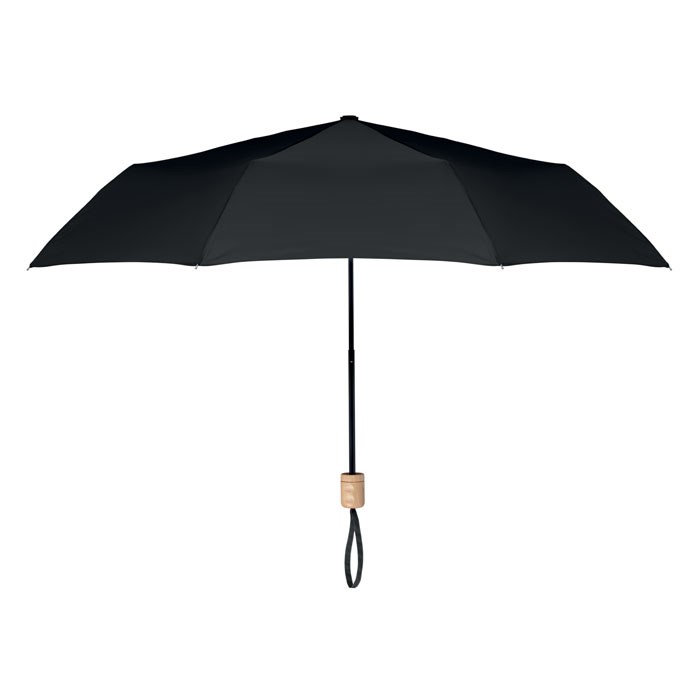 21'' Regenschirm aus 190T RPET Pongee. Stangen und Spitzen aus schwarz überzogenem Metall. Griff aus Holz. 3fach gefaltet. Passende Schirmhülle. Manuelle Öffnung und Schließung.