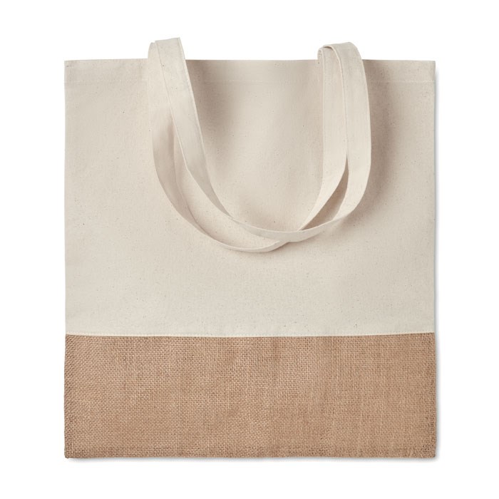 Einkaufstasche mit Besatz aus Jute. Lange Tragegriffe. Baumwolle 160 g/m². mehr