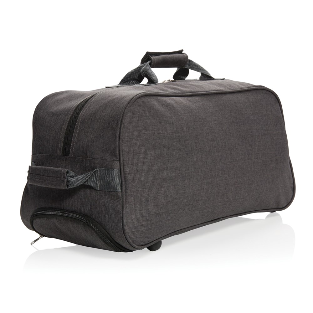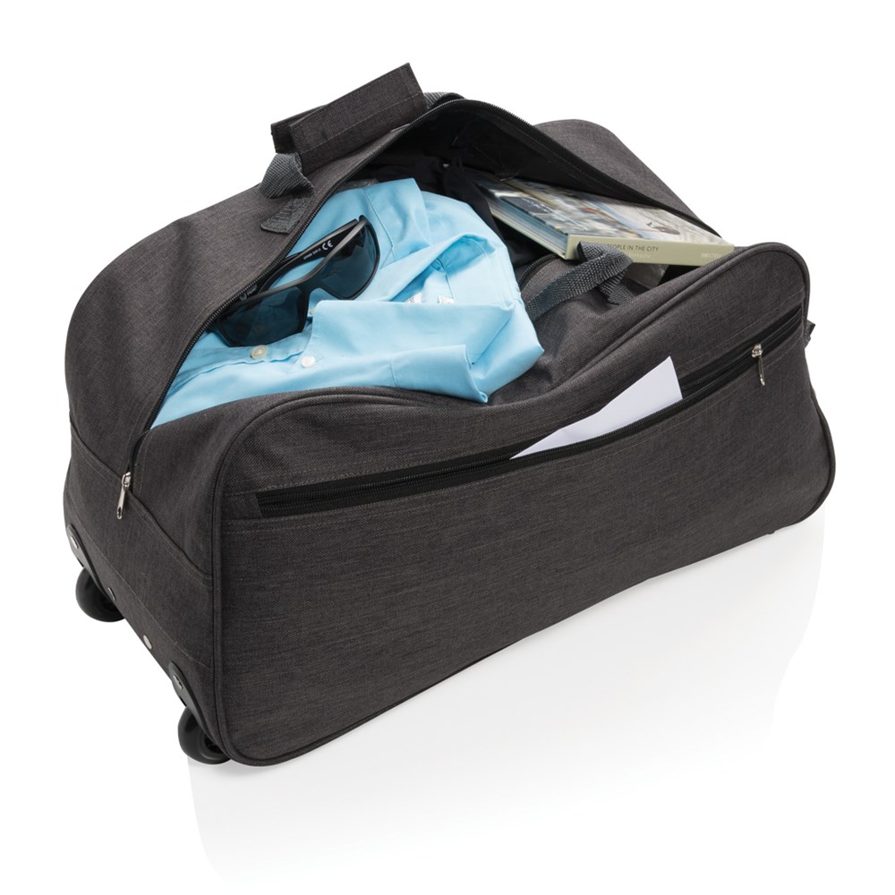 Wochenendtasche aus 600D Polyester mit ausziehbarem Trolley-System. Eine Fronttasche und ein großes Hauptfach.