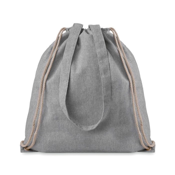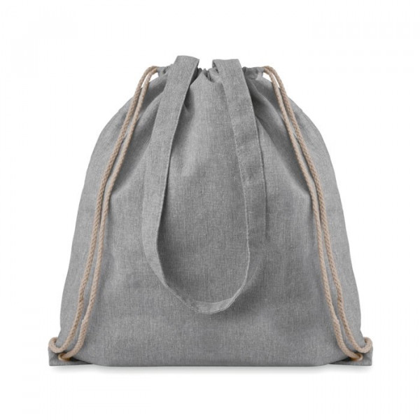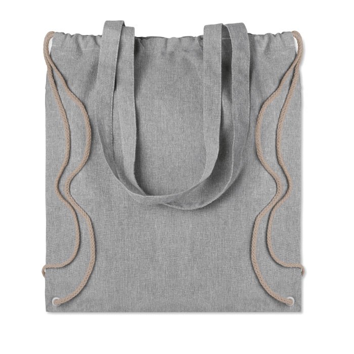 2 tone (recycelte Baumwolle und recyceltes Polyester) Einkaufstasche mit Kordelzug und langen Henkeln (20%/80%). ca. 140 gr/m². Dieser Artikel kann nach dem Bedrucken schrumpfen.