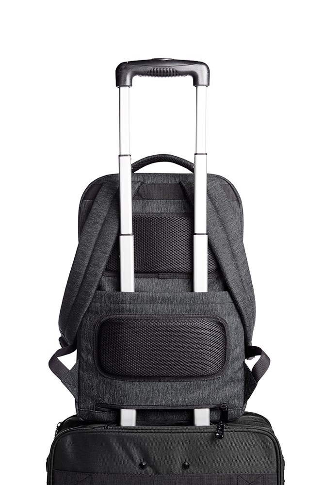 gepolsterter Businessrucksack mit aufwändig gesteppter Front und HFL® Träger für Ihr Logo; gepolstertes Hauptfach mit flachem Einsteckfach geeignet für DIN A4-Unterlagen; Reißverschluss-Vortasche mit zwei flachen Einsteckfächern; gepolstertes Reißverschluss-Notebookfach; gepolsterter Rücken mit verstecktem Reißverschluss-Fach auch zur Befestigung am Trolley-Gestänge geeignet; längenverstellbare gepolsterte Schultergurte; gepolsterter Handgriff