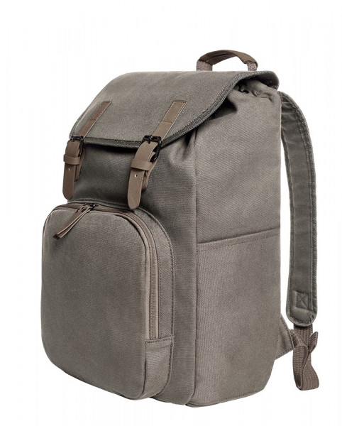 Überschlag mit verstellbaren Zierschnallen und Magnetverschluss; großes Hauptfach mit Kordelzugverschluss; gepolstertes Notebookfach; Vortasche mit 2-Wege-Reißverschluss; seitlich zwei flache Einsteckfächer; Handgriff mit Griffmanschette; gepolsterte, längenverstellbare Schultergurte; wertige Metall-Accessoires und PU-Velourskunstleder-Accessoires