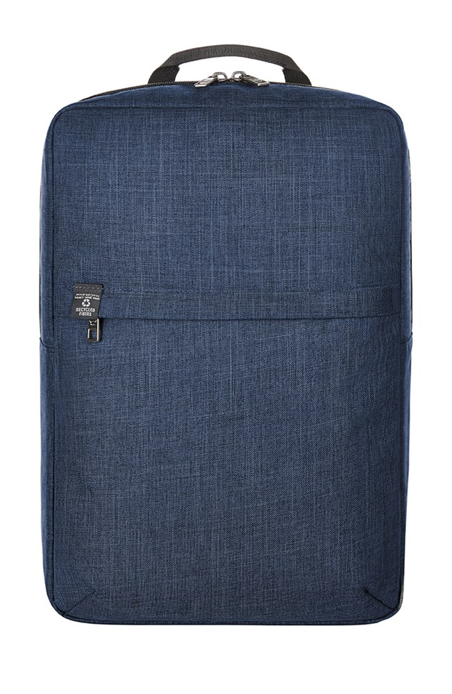 gradlinig gearbeiteter Rucksack; rPET Obermaterial; großes Hauptfach mit 2-Wege-Reißverschluss und gepolstertem Notebookfach; Reißverschluss-Vortasche; aufwändig gepolsterter Rücken mit verstecktem Reißverschlussfach; längenverstellbare gepolsterte Schultergurte mit Gummischlaufen zum Befestigen von z.B. Sonnenbrille; Handgriff