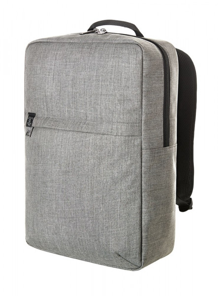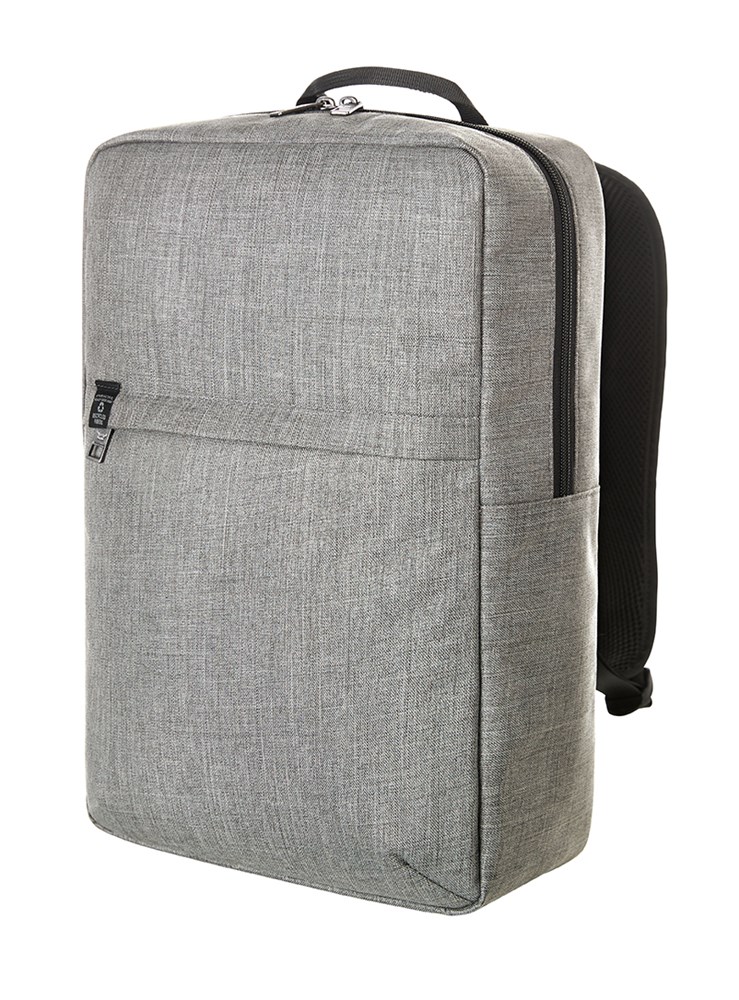 gradlinig gearbeiteter Rucksack; rPET Obermaterial; großes Hauptfach mit 2-Wege-Reißverschluss und gepolstertem Notebookfach; Reißverschluss-Vortasche; aufwändig gepolsterter Rücken mit verstecktem Reißverschlussfach; längenverstellbare gepolsterte Schultergurte mit Gummischlaufen zum Befestigen von z.B. Sonnenbrille; Handgriff