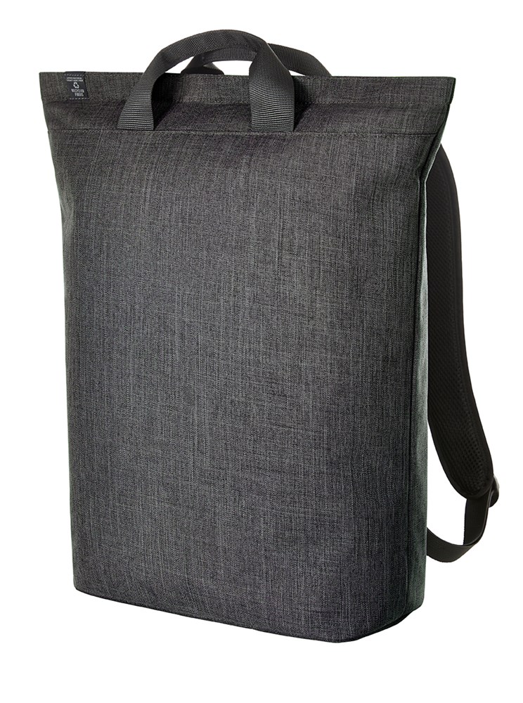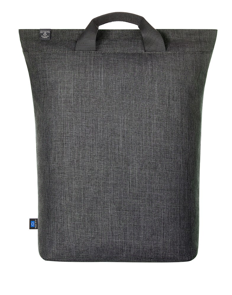 gradliniger, moderner Rucksack; Reißverschluss-Hauptfach mit gepolstertem Notebookfach; rPET Obermaterial; wertige Metall-Accessoires; gepolsterter Boden; aufwändig gepolsterter Rücken mit verstecktem Reißverschlussfach; längenverstellbare gepolsterte Schultergurte mit Gummischlaufen zum Befestigen von z.B. Sonnenbrille; Handgriffe