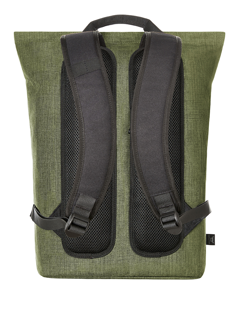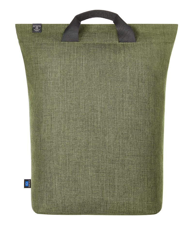 gradliniger, moderner Rucksack; Reißverschluss-Hauptfach mit gepolstertem Notebookfach; rPET Obermaterial; wertige Metall-Accessoires; gepolsterter Boden; aufwändig gepolsterter Rücken mit verstecktem Reißverschlussfach; längenverstellbare gepolsterte Schultergurte mit Gummischlaufen zum Befestigen von z.B. Sonnenbrille; Handgriffe