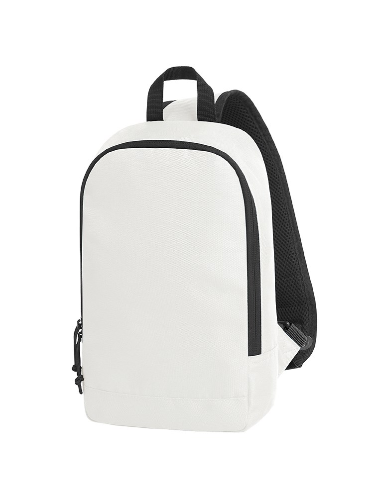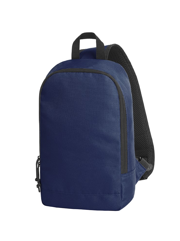 moderner Monostrap-Rucksack; Hauptfach mit 2-Wege-Reißverschluss; flaches Einsteckfach innen; rückseitiges Reißverschlussfach; gepolsterter, längenverstellbarer und beidseitig tragbarer Schultergurt; Trageschlaufe