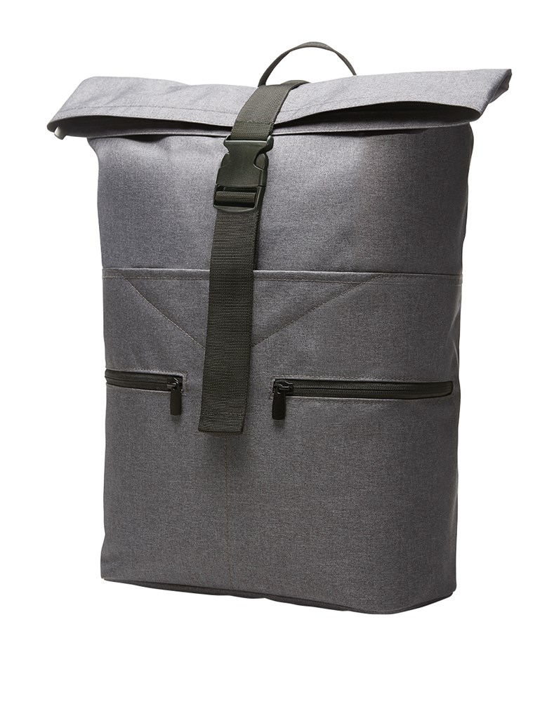 Überschlag-Rucksack mit innovativem Verschlusssystem; großes Hauptfach mit hängendem Reißverschlusstäschchen; gepolstertes Notebookfach; 2 Reißverschluss-Vortaschen; gepolstertes Rücken und Gurte; Handgriff