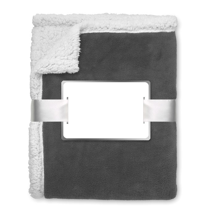 Coral Fleece Decke 200 g/m². Rückseite in Schafsplüsch-Optik aus 220 g/m² Polyester Sherpa. Inkl. Band mit bedruckbarer Karte.