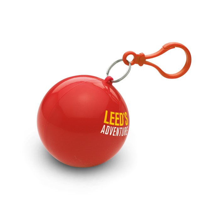 Regenponcho in einer Kunststoff Kugel. Der Poncho ist transparent. Inklusive Karabiner zum Anhängen.